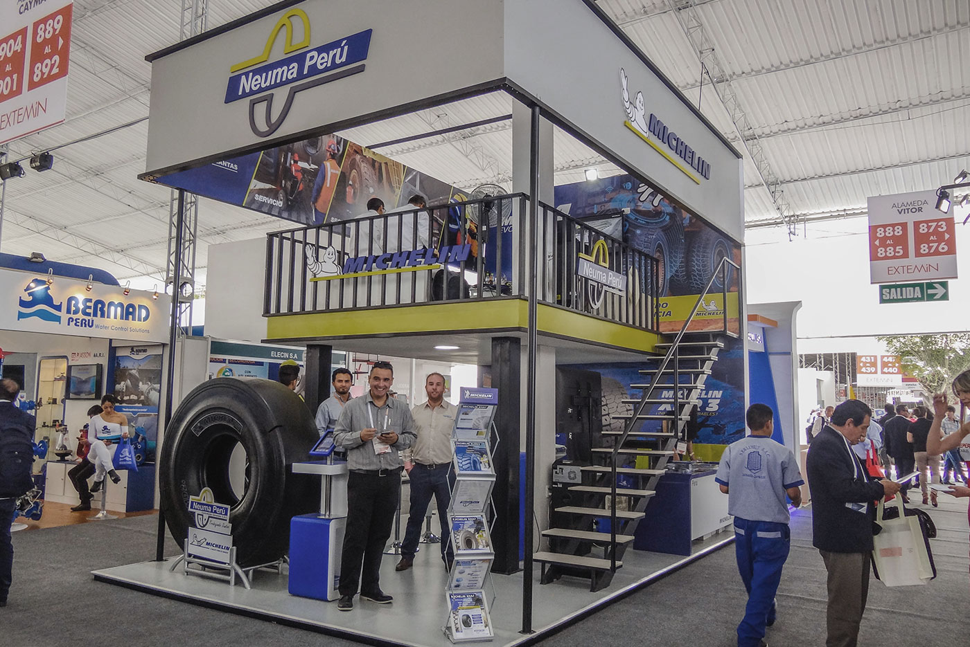 Neuma Perú es una empresa que se encarga, a nivel nacional, de la distribución y comercialización de neumáticos Michelin. Así mismo, sus servicios incorporan la asesoría post-venta al cliente, así como la reparación, el reencauche y la facilitación de talleres de enllante de neumáticos OTR en minas como una manera sostenible de minimizar pérdidas y reducir el impacto ecológico. De esta manera, el stand propuesto, en un espacio reducido, resuelve distintas zonas para múltiples actividades como de exhibición, información, sala de ventas y espacio de reuniones